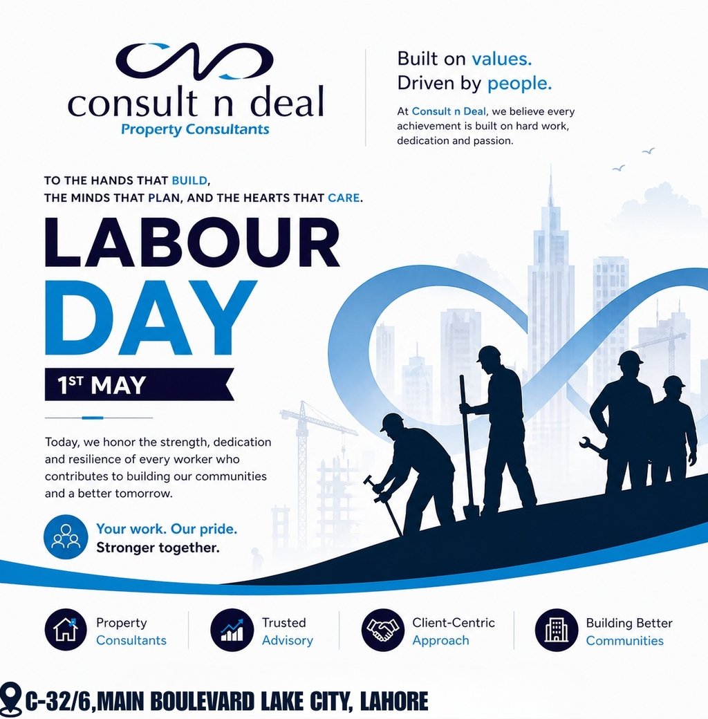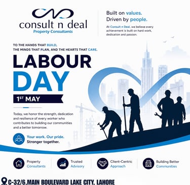 Celebrate Labour Day by recognizing the hardworking individuals behind real estate development. Discover how Consult N Deal supports property growth in Lake City Lahore with trusted consultancy services.